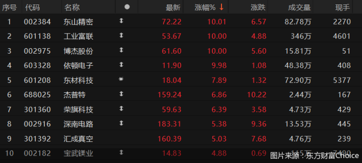 上述消息带动下,东方财富Choice数据显示,9月10日,多只苹果概念个股冲高。截至收盘,东山精密涨停,股价再创新高,同期,工业富联、博杰股份、依顿电子等个股也均涨停。紧随其后,东材科技、杰普特、荣旗科技、深南电路等个股均涨超5%。